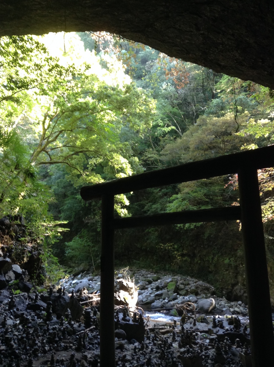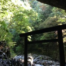 天岩戸神社から渓流の方に下っていき、歩くこと15分程の場所に鳥居のたつ洞窟があります。