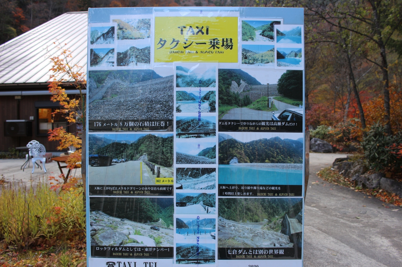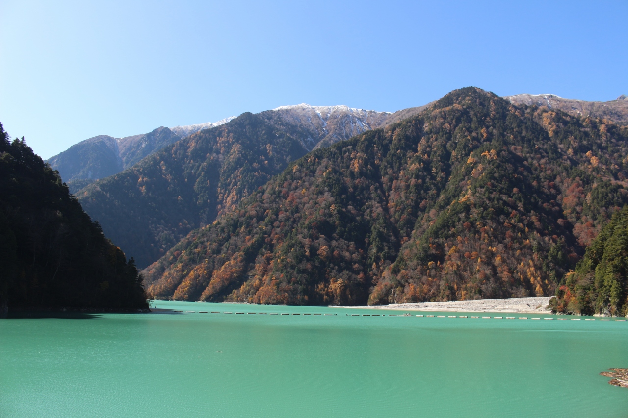 1:15くらいかかったと思います。途中からダムの坂道のつづら折りとなりエメラルドグリーンのダム湖に到着しました。トンネル手前に展望台?があり、かろうじて槍ヶ岳が見えました。湖畔の遊歩道の紅葉はすでに終わりかけでした。