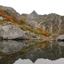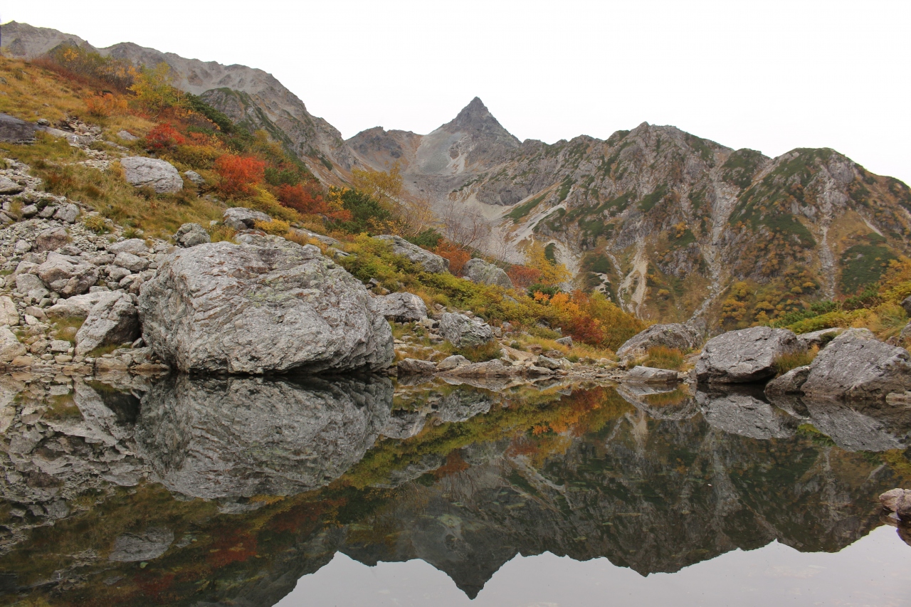 槍沢ロッジに宿泊して逆さ槍のポイントへ向かいましたが、残念ながら天気予報が外れて曇天でした。ただ近くの紅葉はきれいでした。帰る時になって晴れてきてとても残念でした。