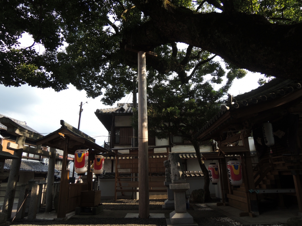 粉河寺大門の手前にある小さな神社ですが、境内にある楠はとても立派で目を引きます。樹齢千年以上の楠だそうで、それに引きつけられて参拝する方もいらっしゃるとか。藤堂高虎が猿ヶ丘城粉河秋葉山に在城の際、氏神として崇敬された神社だそうで、高虎が伊勢へ転封の折に現社殿を改築したといわれています。