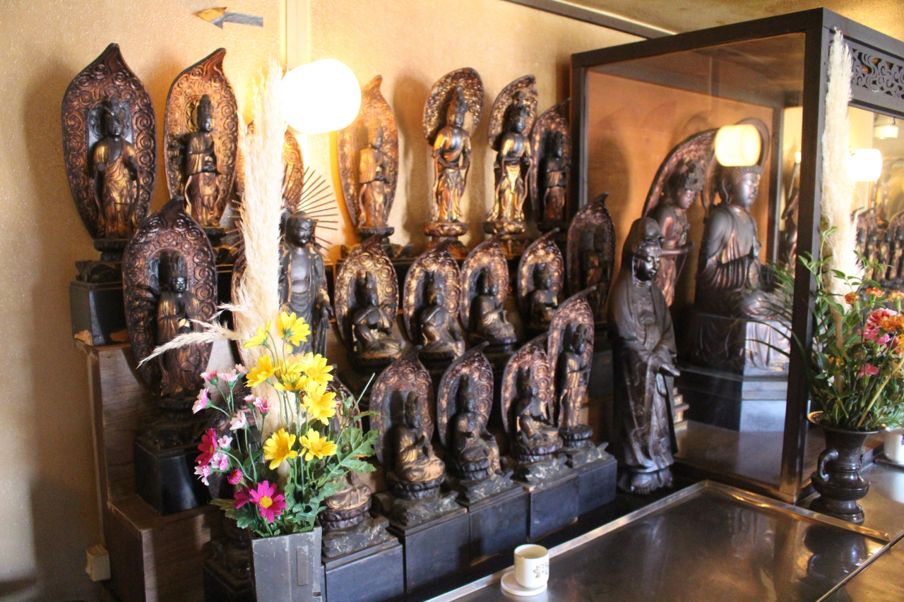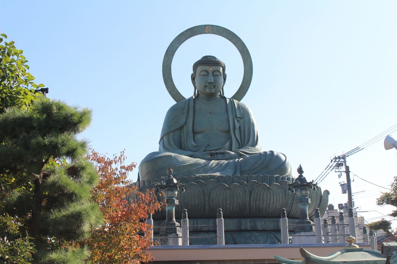 住宅街の中に突如造られた感のある大仏様は落ち着いた青銅色が心休まります。下は一周拝観できるようになっており、地獄絵図から天女の絵まで仏教の世界観を感じた後、最後にたくさんの観音様を拝んで終了というストーリーが感じられ、外だけでなく中にもお参りすることをお奨めします。