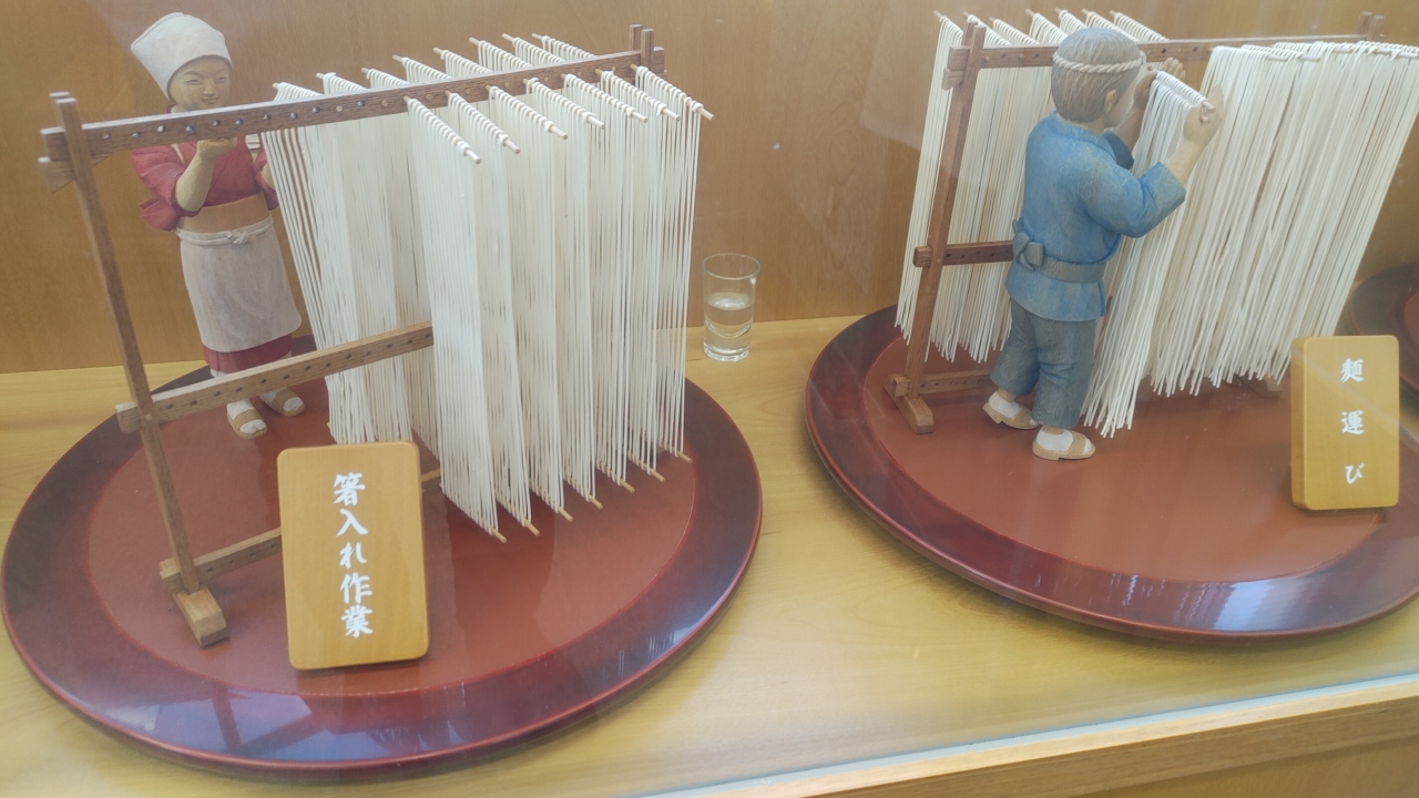 「氷見うどん」の老舗の1軒。工場に隣接した売店なので全粒粉を使ったレア物などを売る一方、折り返した端っこだけを安くした商品もあります。ここから贈答先へ宅配便で送ることもしてくれます。和人形の「そうめんづくりの工程」ジオラマも見ごたえあり。お隣にはレストランもあります。