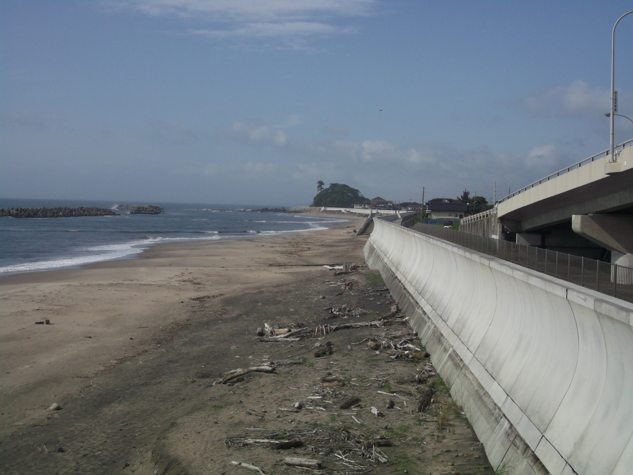 北茨城市の五浦海岸の少し南に広がる海岸です。砂浜は広くはありませんが、浜からそれほど離れていない距離の海上に岩礁の二ツ島の姿が見えます。島の真ん中は波の浸食でぽっかりと穴が開いていて、なかなか見られない不思議な景観です。近くには温泉ホテルもあって、海岸線の景観を眺めながらのんびりと温泉にも浸かれます。