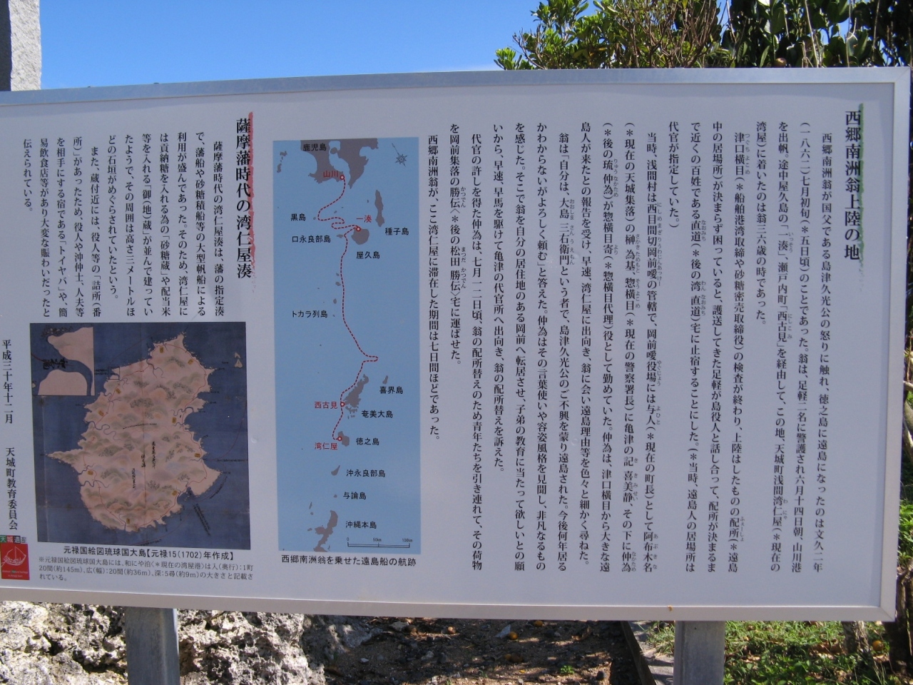 文久二年(1862年)に島津久光の命により遠島となった西郷隆盛が上陸した地点です。島流しと言っても、現地にある説明板によると滞在した約二か月間、島妻愛加那との再会や別れ、島民との交流などがあったようでそれほど退屈しなかったのではと思いました。歴史好きの方には、ここから3kmほど離れた場所に西郷の謫居跡「岡前西郷公園」があるので、あわせて観て回ればよいでしょう。
