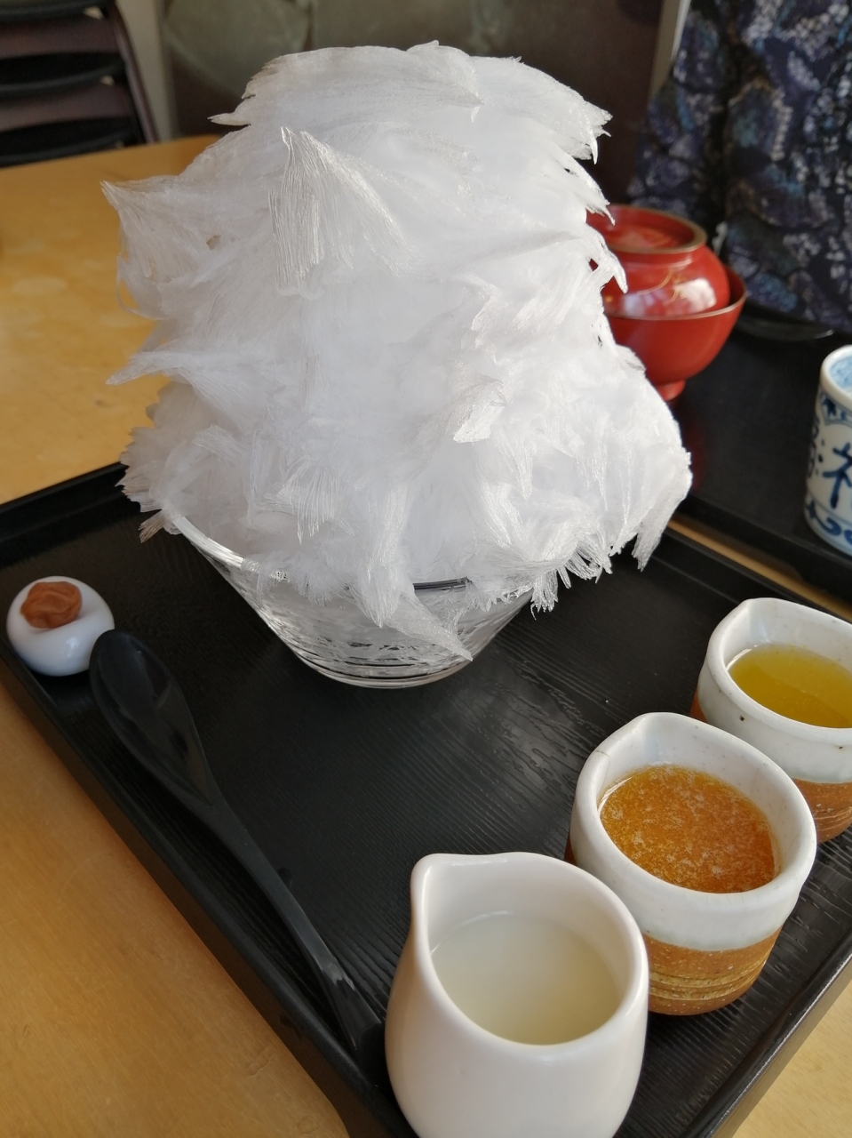 10月末の平日ということで、すんなり入店できました。メニューは季節限定の柿と柚子のかき氷¥1300にしましたが、氷のきめが細かく、シロップも別容器で提供されたので、自分の好きなタイミングで食べることができておいしかったです。両親はしずく餅という上品な寒天?を頂きました。お茶も美味しく上品な和カフェでリラックスできました。