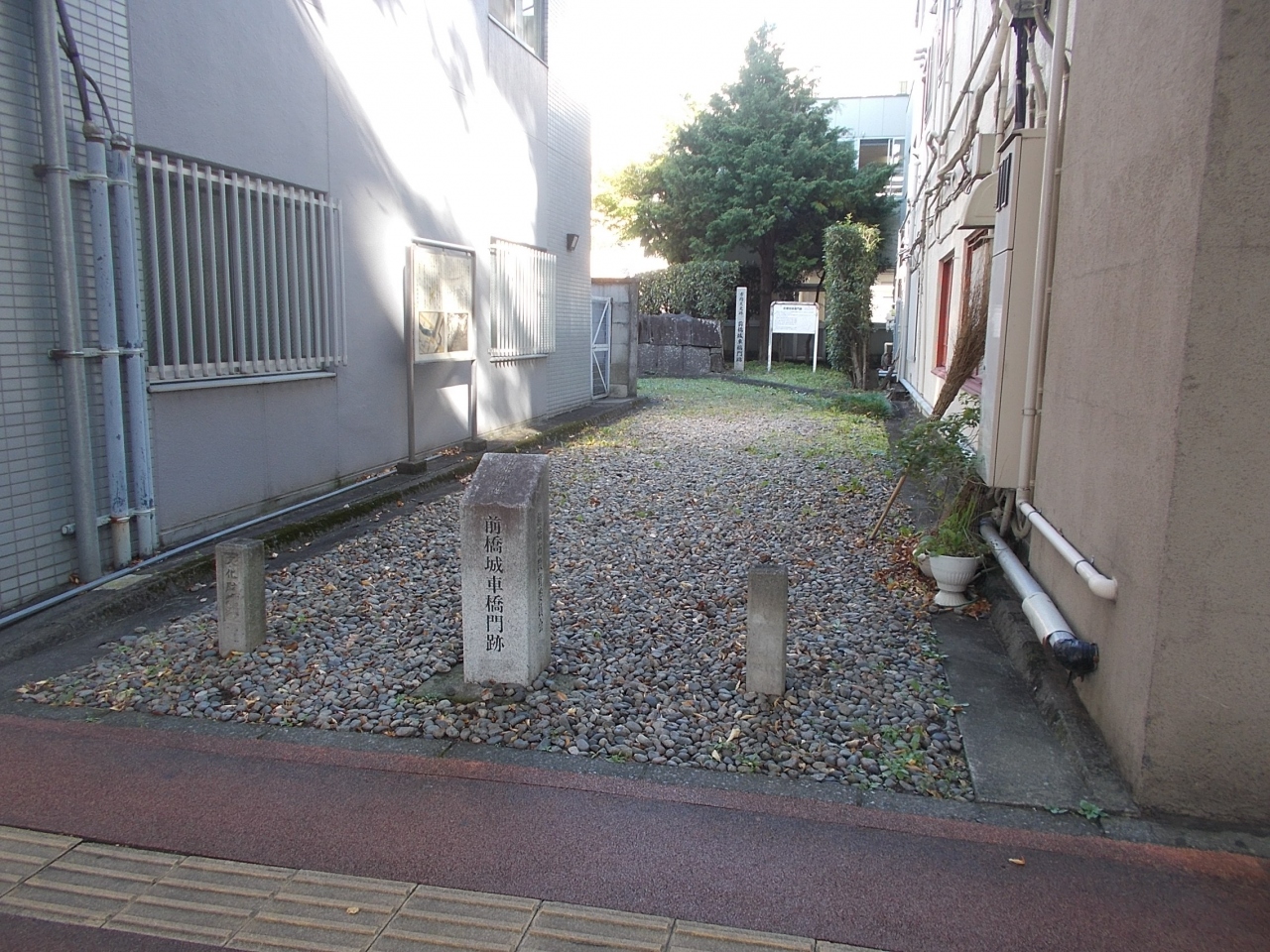 この前橋城車橋門跡は前橋城の本丸跡地である群馬県庁からは東に5分程度の位置にあります。位置からも重要な門だったのでしょう。今は建物の間にひっそりと門の石垣の土台が残っています。当時の門の様子がわかります。また前橋城の全体の様子も掲示されています。かつての城のすごさを少し感じます。