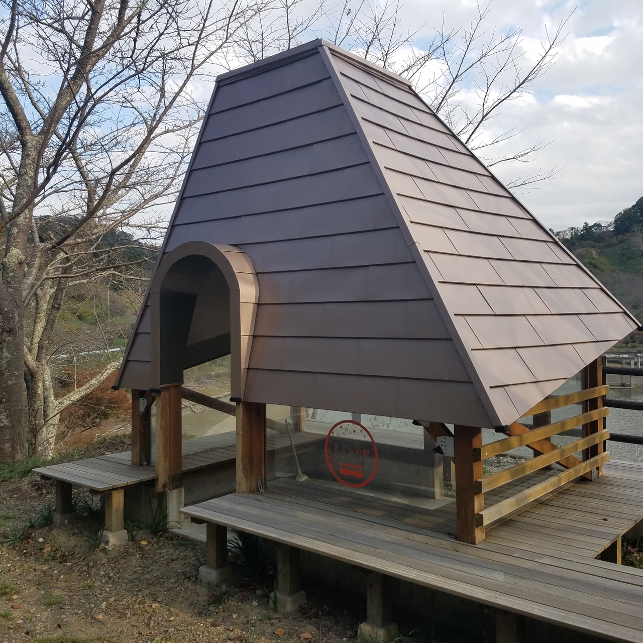 ダムにはバス停、駐車場もありました。