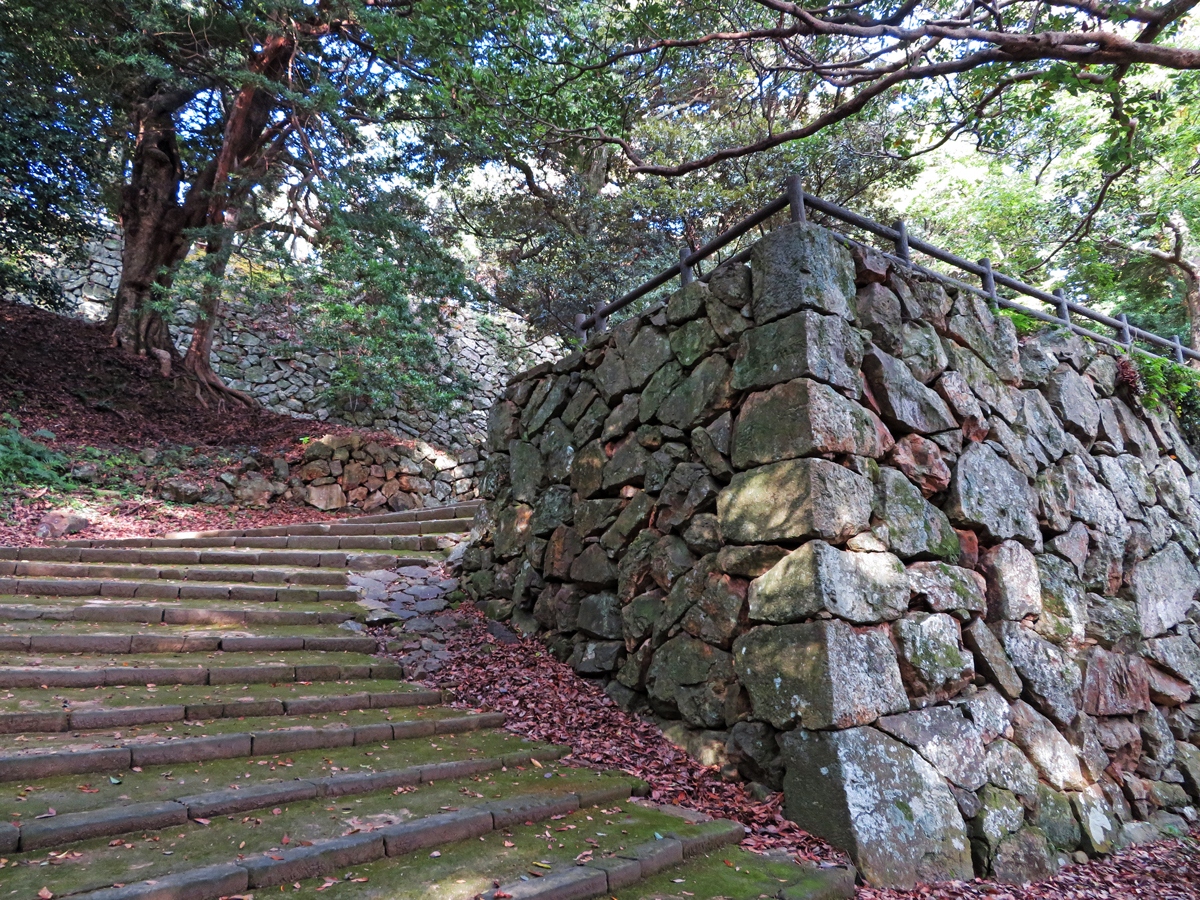 続日本100名城に指定される浜田城。今回は浜田駅から徒歩でアクセスしました。海に突き出すような形状の小高い山の上にあり、現在は中腹には神社があります。続日本100名城スタンプはこちらの社務所でいただくことができます。神社より先は木々が茂る場所になりますが、比較的幅の広い石段を登るようになりますので、本格的な装備までは必要ありません。この城の魅力の1つは立派な石垣で、階段状に連なる部分や断崖に建つ石垣が美しい場所でした。また、外の浦港を見下ろす眺望も見事でした。