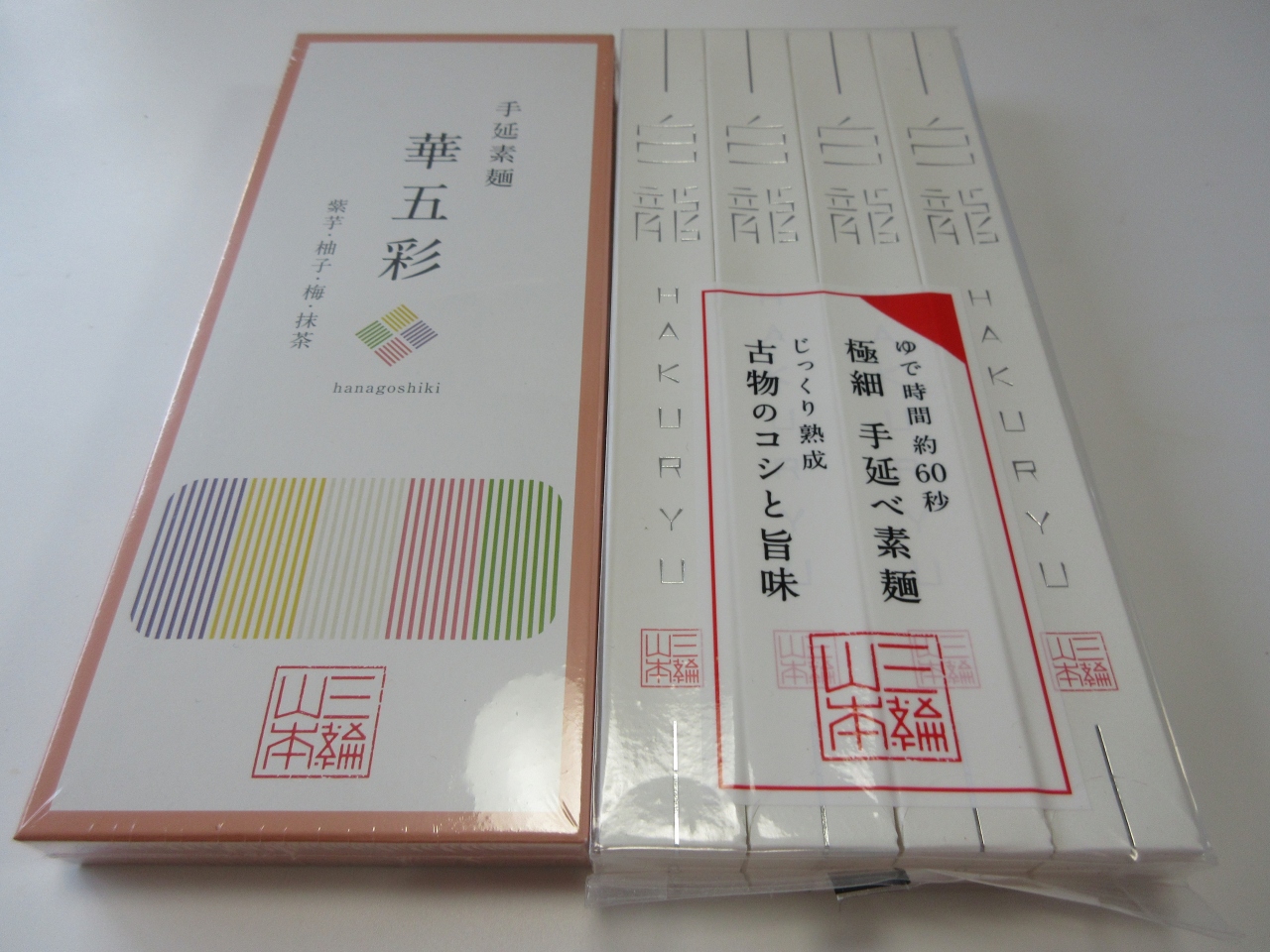 近鉄奈良駅東口改札口そばにあるタイムズプレイスで自宅用と土産用に三輪山本のそうめんを買いました。白龍を開けて普段食べているそうめんと比べて細いのにまず驚きました。短いゆで時間の後、氷水でしめました。安いそうめん独特のにおいが全くなく、細いのにしっかりした歯ごたえとのど越しの良さに再び驚きました。値段の高さに納得しました。隣家への土産に選んでよかったです。孫たちの家に華五彩を買いました。紫芋、柚子、梅、抹茶で色がついたそうめんと白いそうめんの五束が入っています。子どもたちが喜びそうな土産になりました。
