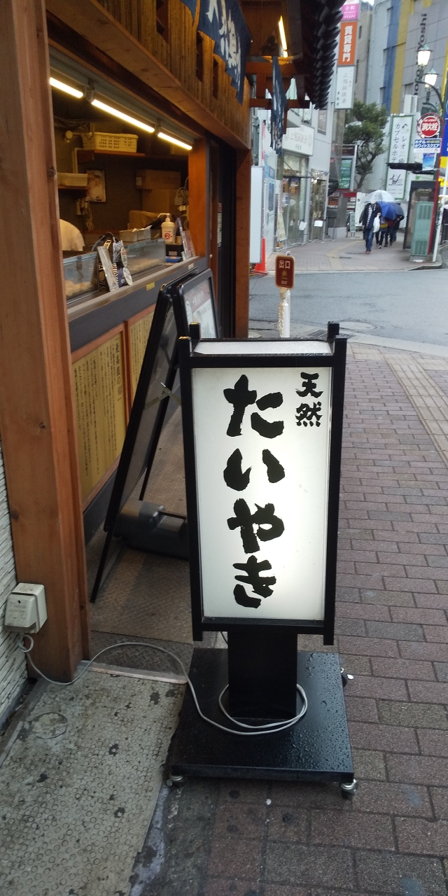 JR船橋駅と京成船橋駅の中間位のロケーションに広々と横長のお店で鯛焼きを焼くデモンストレーションを行い道行く通行人にアピールしています。天然物とは魚の鯛ではなく鯛焼きのこと。十勝産の小豆を使ったりの意味。鯛焼きは割りと小ぶり