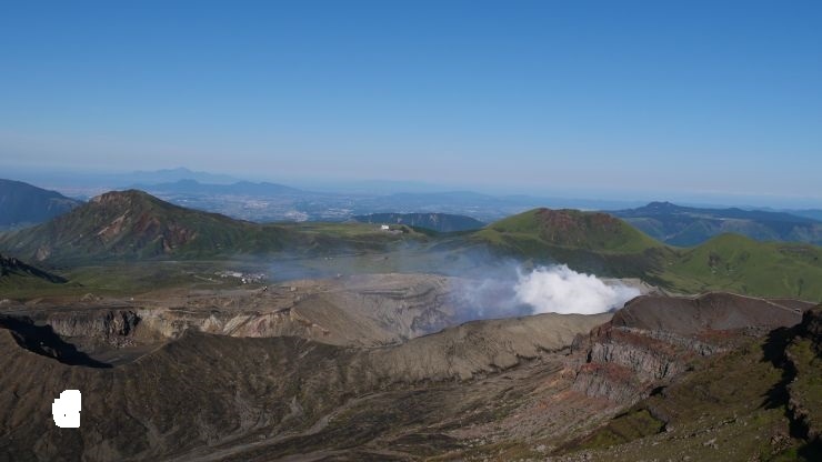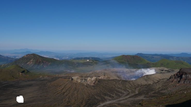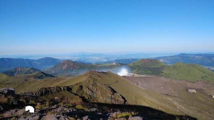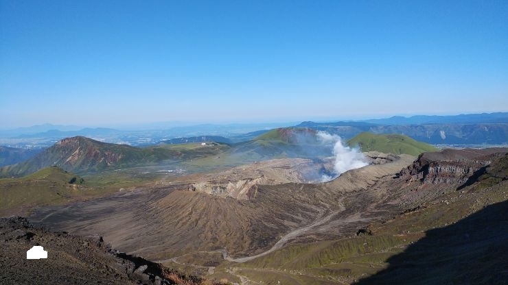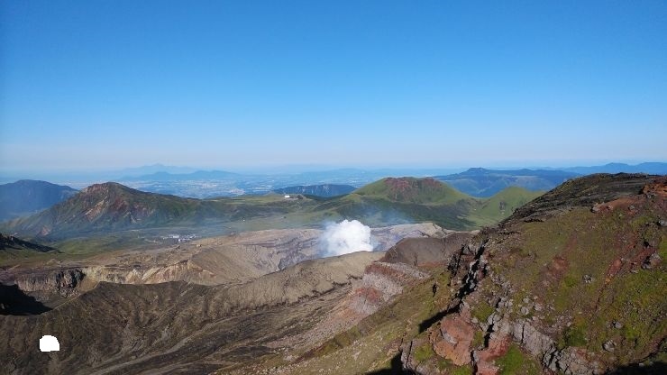 阿蘇山の登山ルートは規制対象外だったので、登山ルート上から火口見学。結構な量の噴煙が噴き出しており、この瞬間に爆発が起きたら怖いなと感じた。