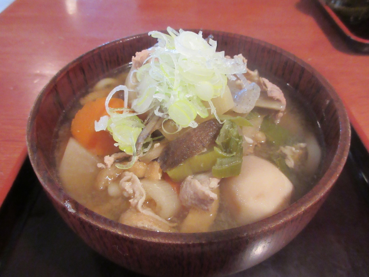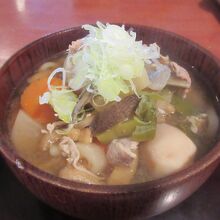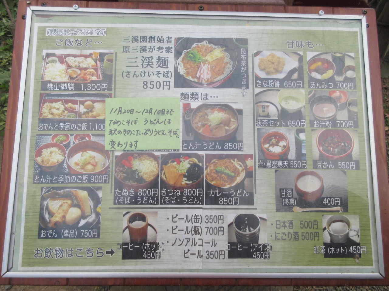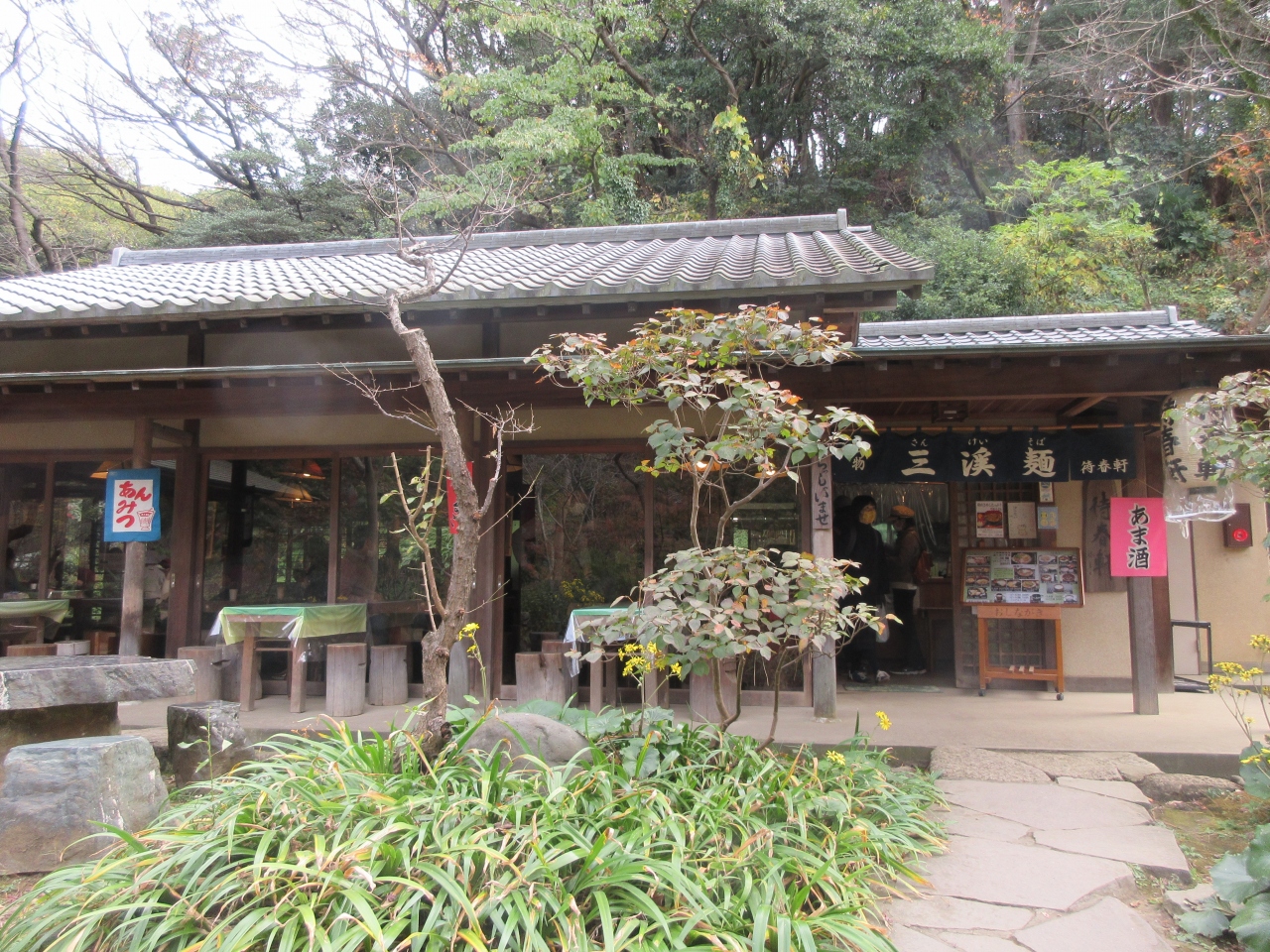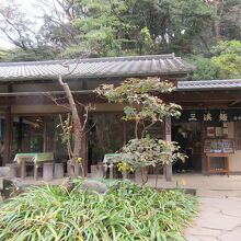 開園と同時に入り園内をゆっくり散策して、寒くなったので昼には早かったですが昼食で利用しました。原三渓が考案した原家の家庭料理である三渓そばが名物です。そばと言っても細いうどんの上にしいたけ、竹の子などの細かく切った食材を酢と生姜で味付けしたあんがかかっていて、彩りよく少量の卵、ハム、さやえんどうがのっていました。あんをうどんに絡めて食べました。酸味と生姜が美味しかったです。三渓そばに昆布茶がついてくるのも特徴です。豚汁うどんは具が多く、薄味のつゆが味噌味の豚汁と異なっていました。身体が温まりました。
