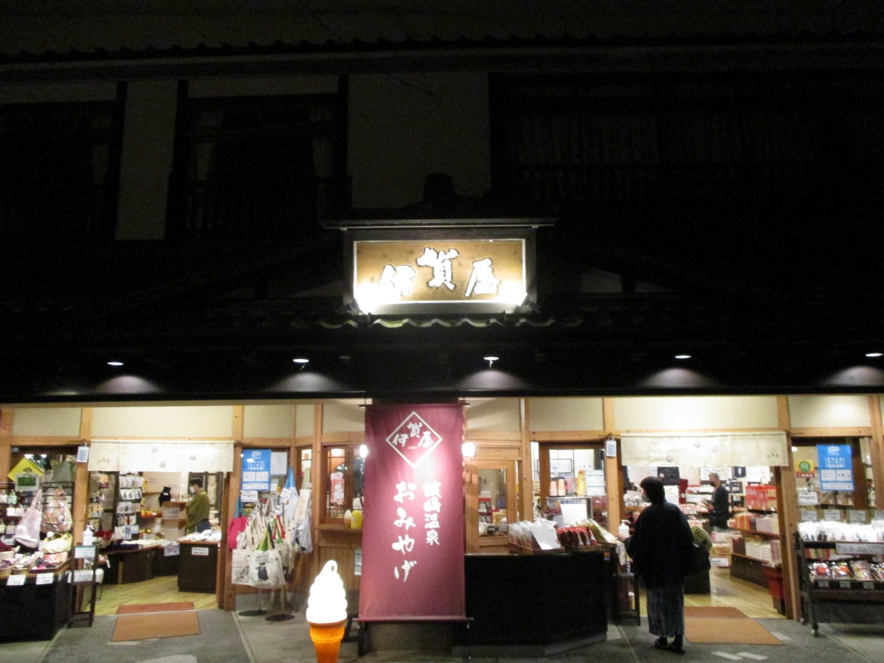 城崎温泉の中では一番賑やかな通りに面していて、一の湯や御所の湯も近いので、人通りも多く、夜遅くまで営業していました湯上りにテラスでソフトクリームを食べることもできるようです。現在の店主は7代目だそうです。