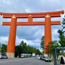 平安神宮に続く神宮道を跨いでそびえ立っている大きな鳥居。