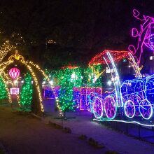 真っ青な巨大ツリー、蒸気機関車、光のアーチトンネル、お花のイルミネーションなどを見ながら、夜の散策を楽しみました。