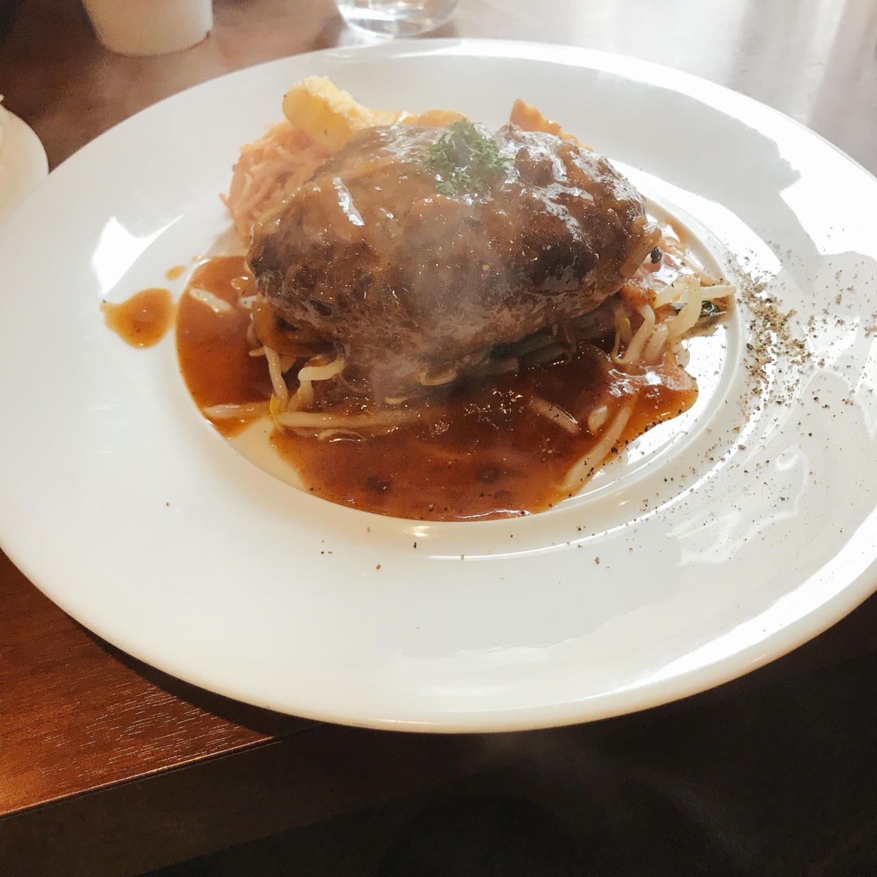 大阪メトロ四つ橋線肥後橋駅から少し離れた場所にありますが、人気のビストロです。今回は開店直前に行ったので一番乗りでしたが、次から次へとお客さんが入ってきていました。一番人気メニューの「手ごねハンバーグステーキ・デミグラスソース(税込900円)」をオーダーしましたが、口コミ通り、肉汁溢れる美味しいハンバーグでした。