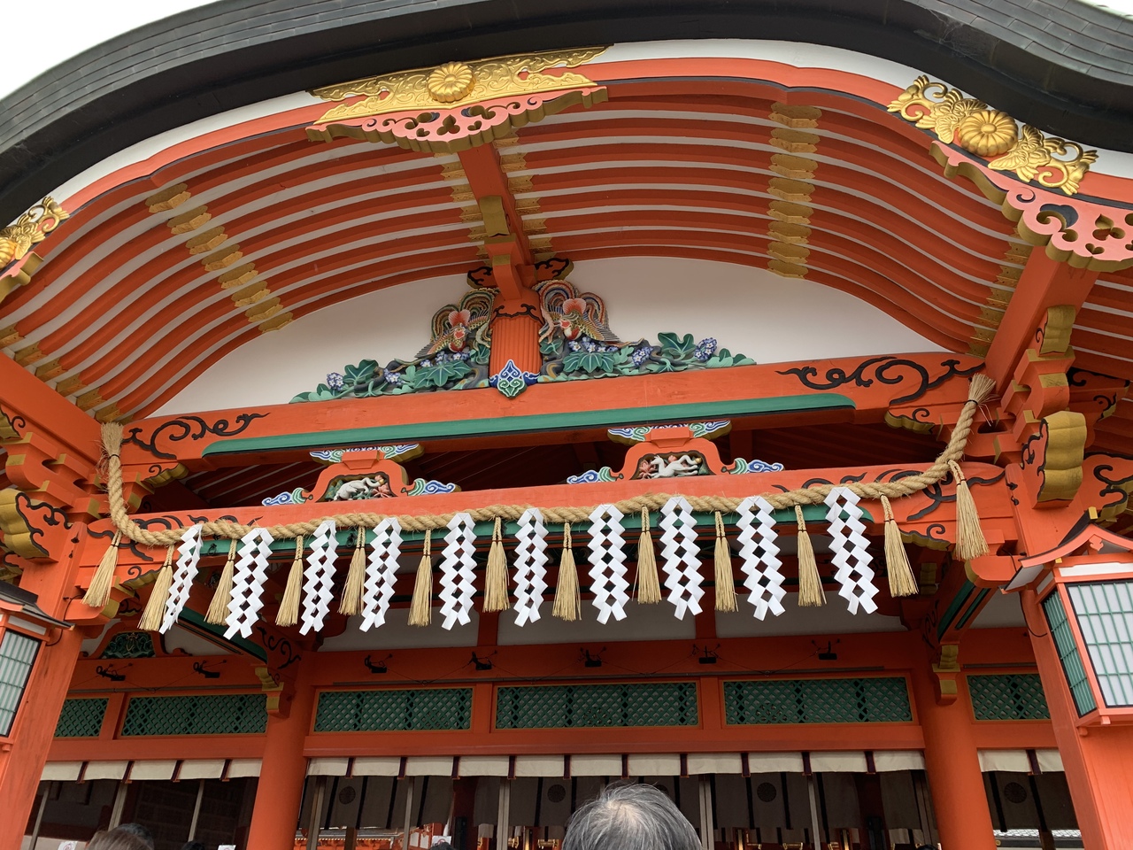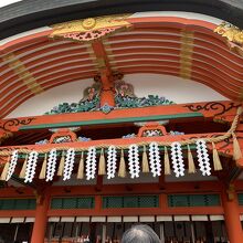 桜門から進んでいくと本殿があります。屋根が特徴的でかまぼこ型で横に長い形をしていました。1499年に創建され、重要文化財に指定されています。屋根の装飾が素晴らしく、可愛い白狐の彫刻もありました。中は撮影禁止です。