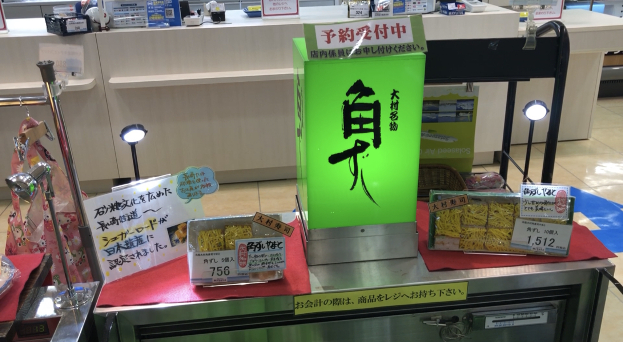 長崎空港の2階にあるお土産物屋さんです。毎回、長崎空港で最後に買うのは「大村角すし」を購入します。これは押し寿司の様なものですが、錦糸卵で下のお米が見えないくらいボリューミーなお寿司です。このお店には、他にも海鮮物や肉類など色々と置いてあります。見るだけでも楽しいです。