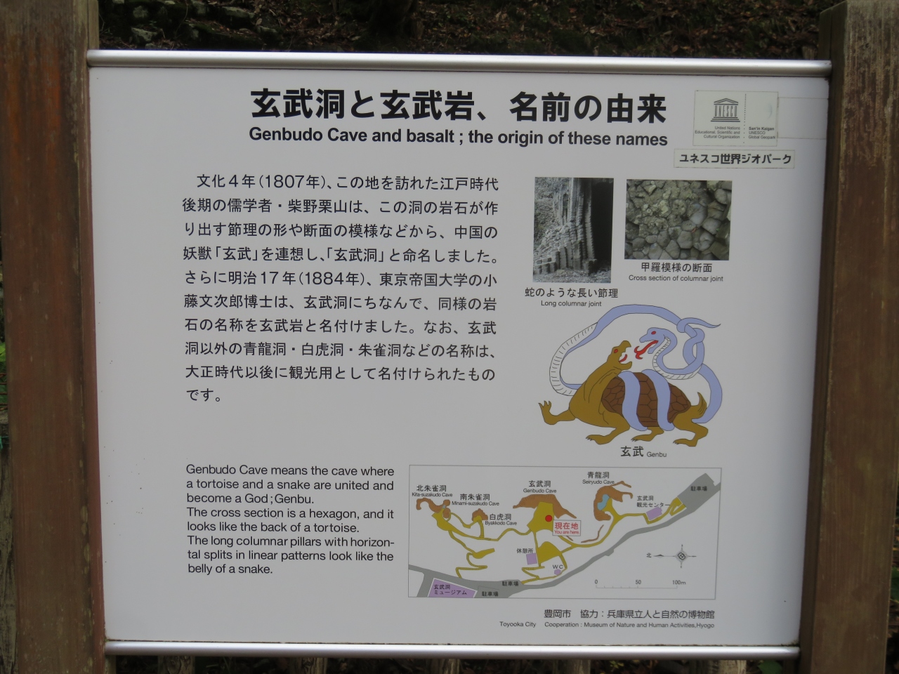 玄武洞はその中でも最大のもので、玄武岩の名前の元になっている天然記念物です。確かに玄武を想像させる綺麗な六角形の柱状節理は貴重なものです。