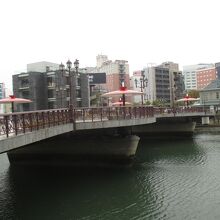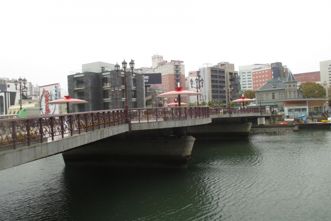 城下町福岡と商人の町博多を結ぶ橋なのだと、ずいぶんと思い入れのこもった命名をされた橋です。人専用ですから凝ったデザインで見ていても楽しくなる様です。ところで、こんなところに黒田節がデザインされています。それは途中にあるパラソルで、黒田節をイメージして杯と槍がデザイン化されているそうですよ。