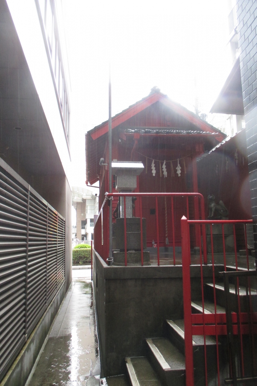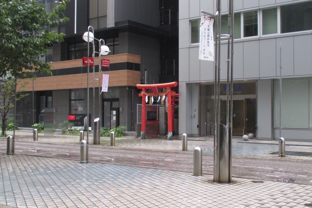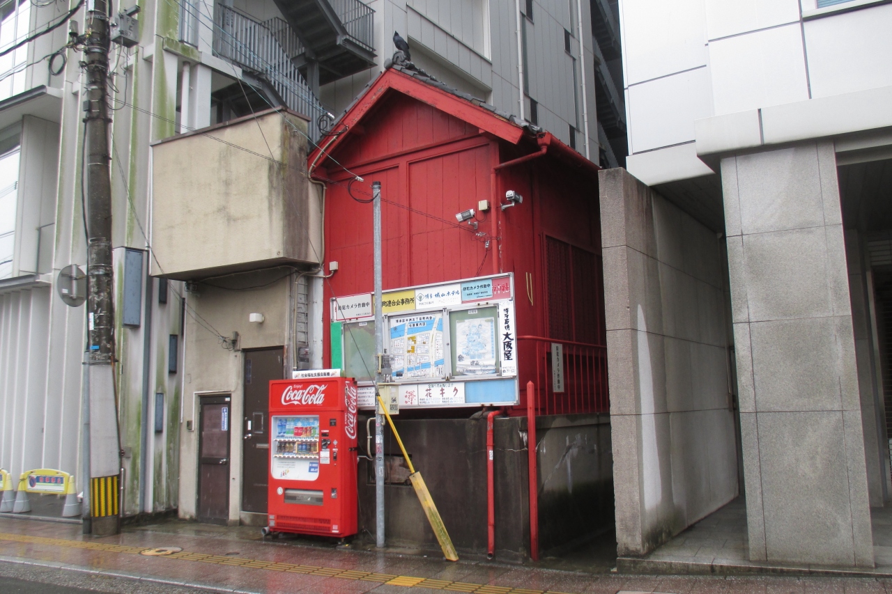 博多川に架かる博多ことぶき橋の方から見ると、ビルの間に赤い四角い小屋の様なものが見えます。中洲国広稲荷神社本殿の裏側です。その横の50cmくらいの隙間から本殿に行けますし、ぐるっと回り込んで中洲中央通りからは鳥居を潜ってお参りが出来ます。