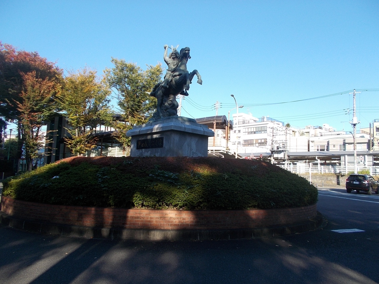 この新田義貞公之像は京王線分倍河原駅の東口の駅前広場にたてられています。この辺りで新田義貞は鎌倉幕府軍とたたかい勝利を収めたのです。像は青銅造りで騎馬像です。馬が威勢よく跳ね上がり剣をかざした勇敢な姿です。力強さを見せています。