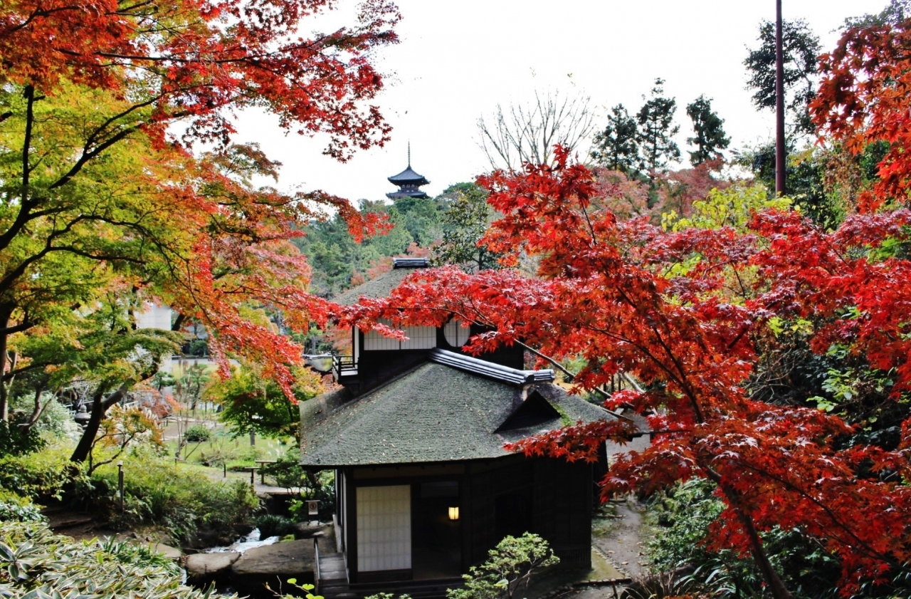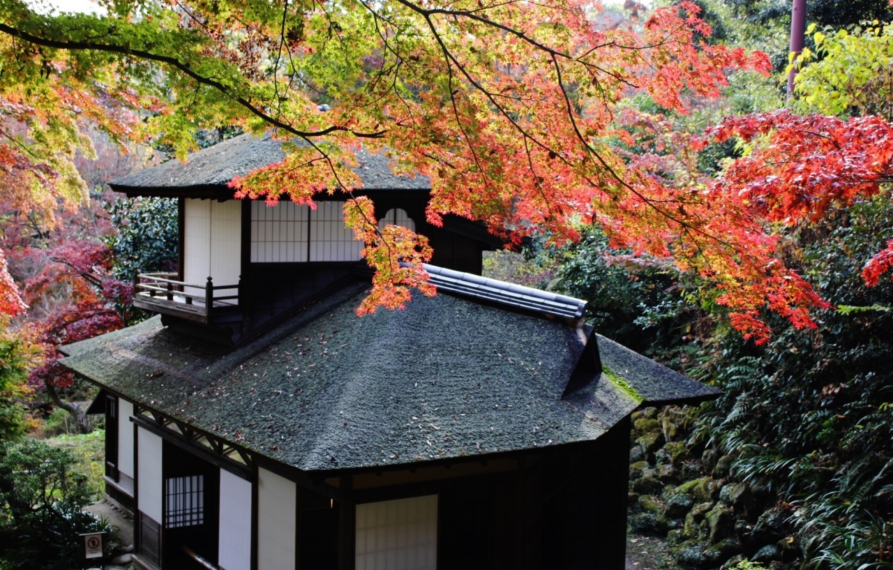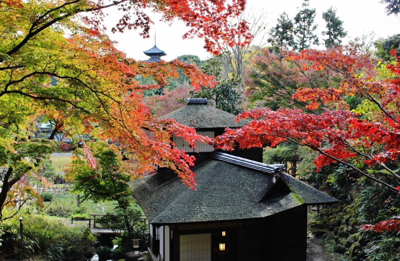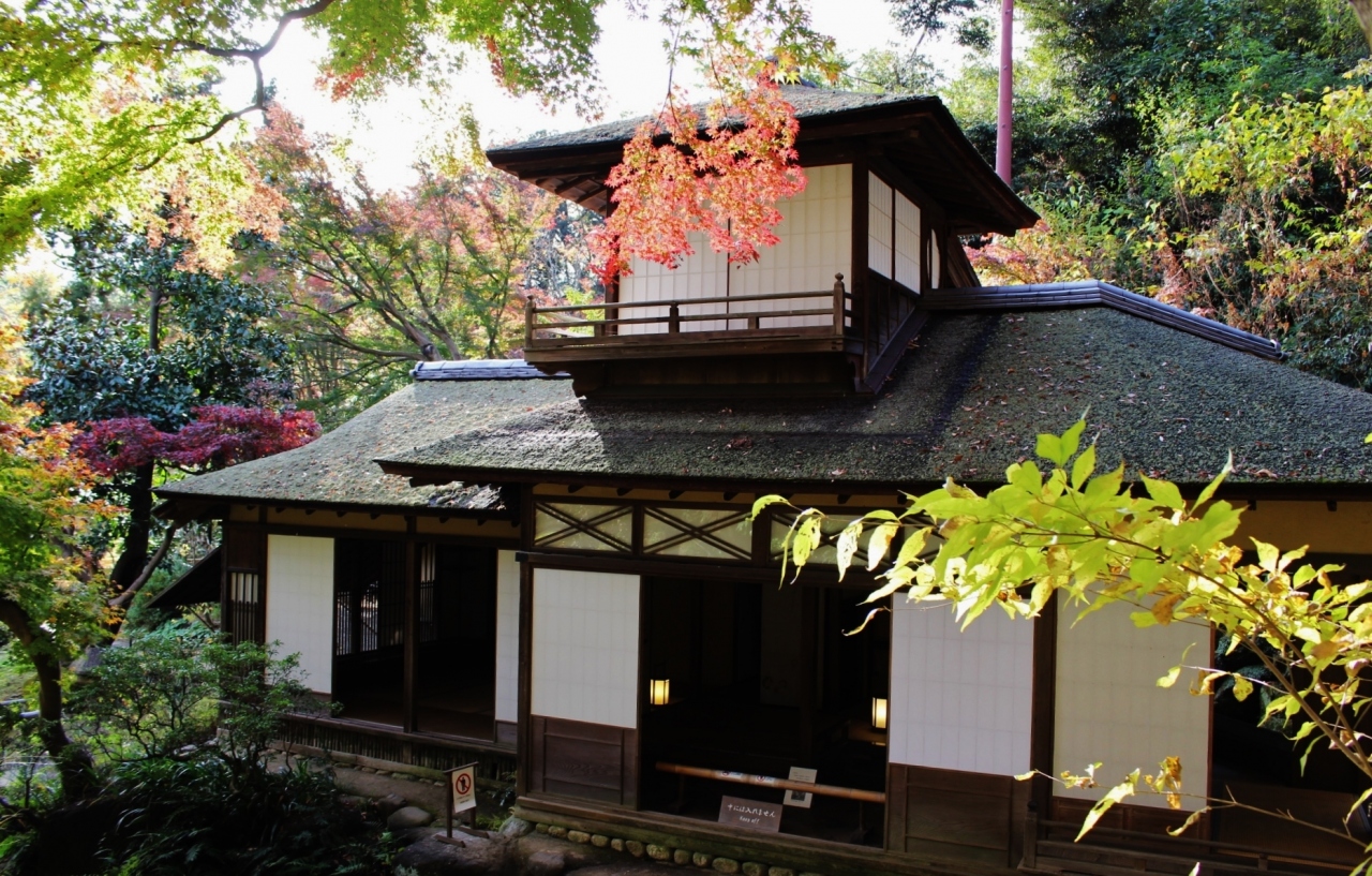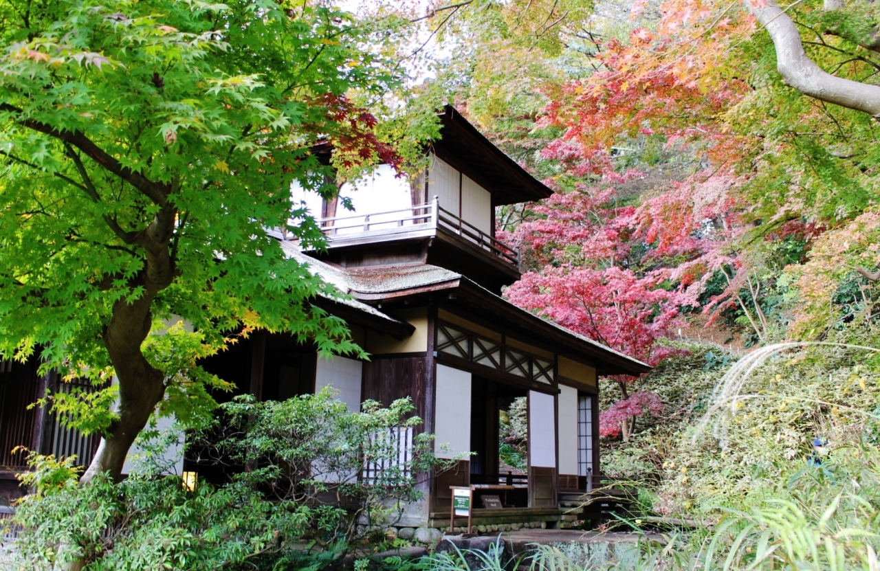 複雑な構造の建築が映える 三渓園随一の紅葉スポット