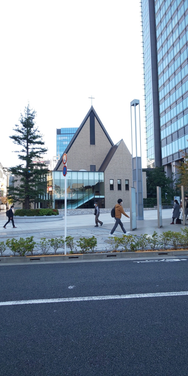 この教会の近くにそびえ立つサクラテラスのガラス張りの建物と全く無関係なはずなのに、無関係とは感じさせないくらい外観デザインが合っていました。