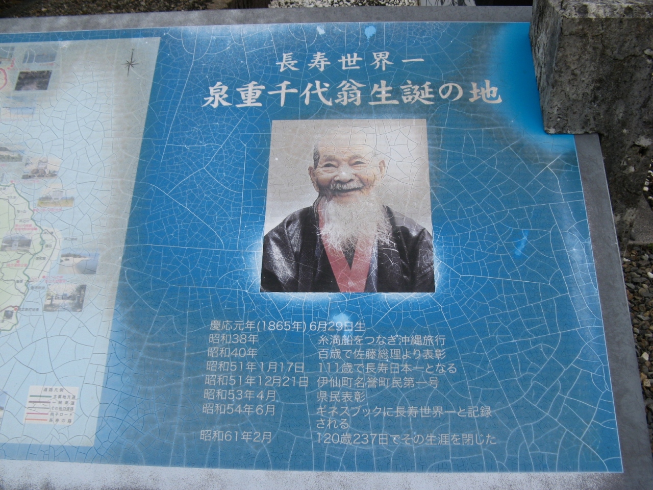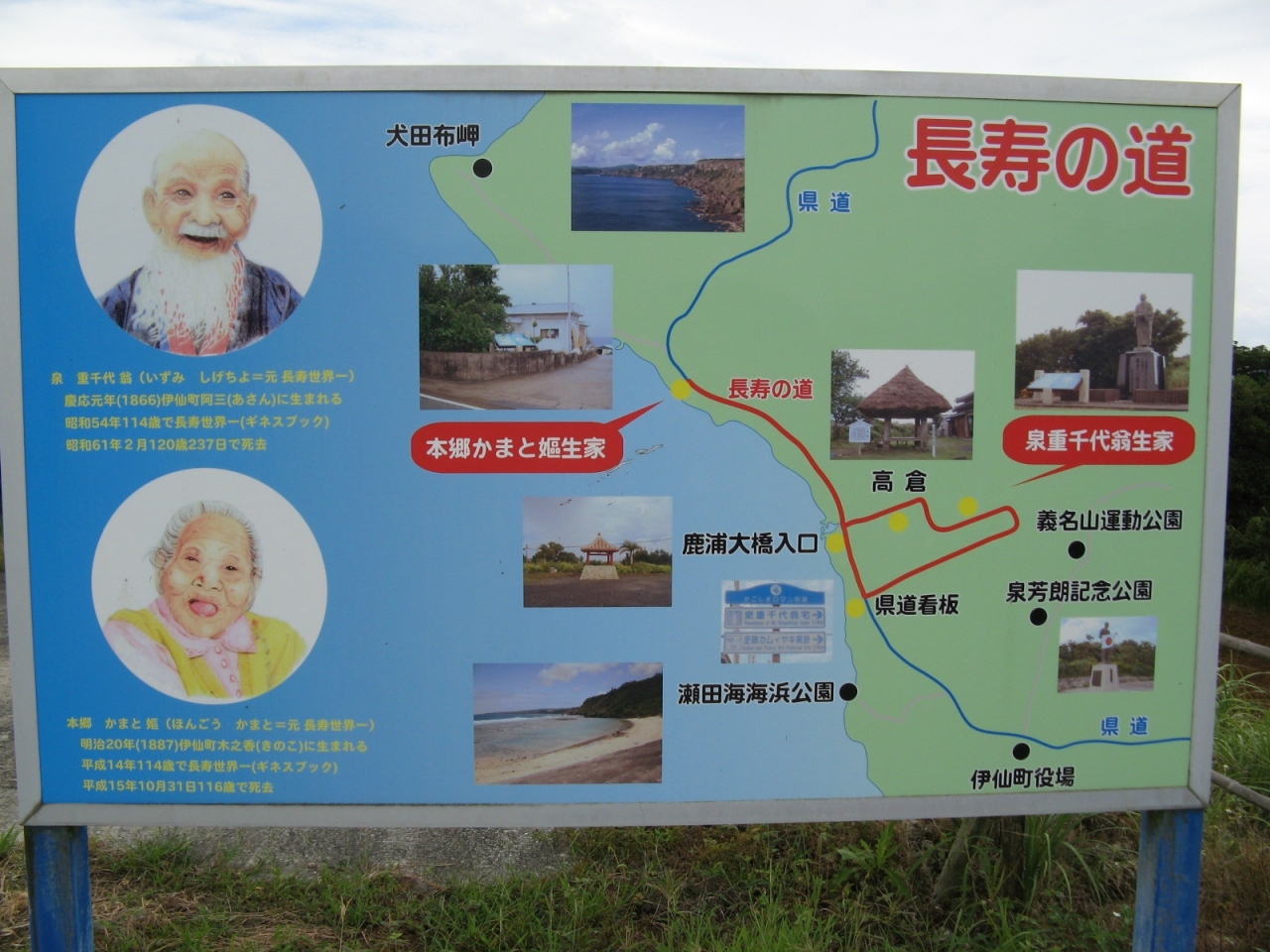 昭和51年に長寿日本一となり、昭和57年に翁の功績と長寿を讃えて建立された銅像です。泉重千代さんと世界最高齢の女性本郷かまとさんは伊仙町で生まれ、一時期世界最高齢の人物としてギネス世界記録に認定されていたが、年齢に異論が唱えられ世界記録の認定を取り消された。しかし、少なくともお二人が百歳を超えていたのは間違いないところです。こんな小さな町から百歳以上が二人も出るのはすごいことで、町も“長寿の道”として辺り一帯を観光地化しています。二人の長寿にあやかれるよう“長寿の道”を歩いて回りました。銅像の近くには5台ほど駐車できる場所があります。