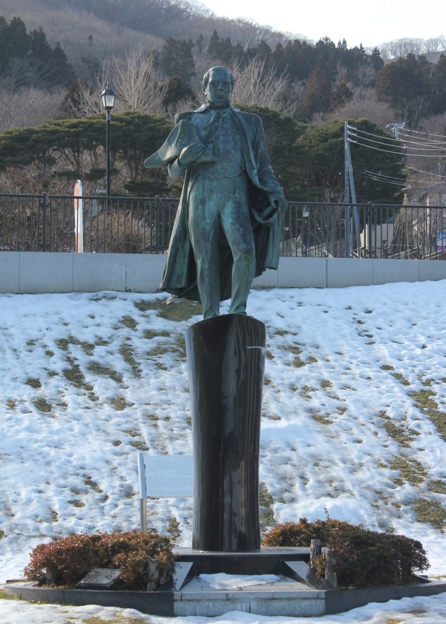 立像と説明板だけしかありませんが、雪の中に立ち函館の町を見下ろすペリー提督像はなかなか凛々しい姿の銅像と思います。