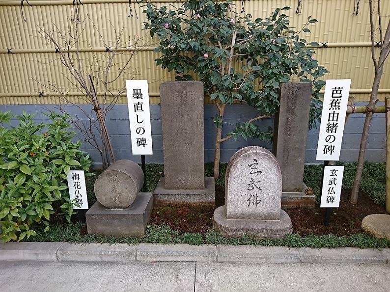 江東区清澄3丁目の清洲橋通り沿いにある臨済宗妙心寺派の寺院です。江戸時代中期の正徳3年(1713年)の創建で、本堂前に玄武仏碑、梅花仏碑、芭蕉墨直しの碑、芭蕉由緒の碑の石碑が保存されておりました。松尾芭蕉ゆかりの寺院なので、松尾芭蕉ファンの方には参拝をおすすめします。