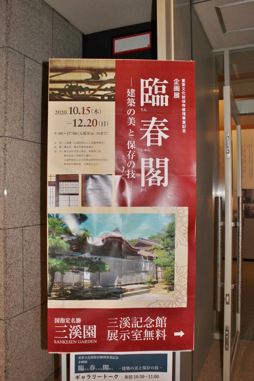 2020年10/15~12/20の期間は、企画展「臨春閣―建築の美と保存の技―」と題して、臨春閣の補修工事に際し取外し補修が行われた欄間や絵画などの装飾品を、臨春閣に戻す前に三溪記念館で特別に公開されていた。