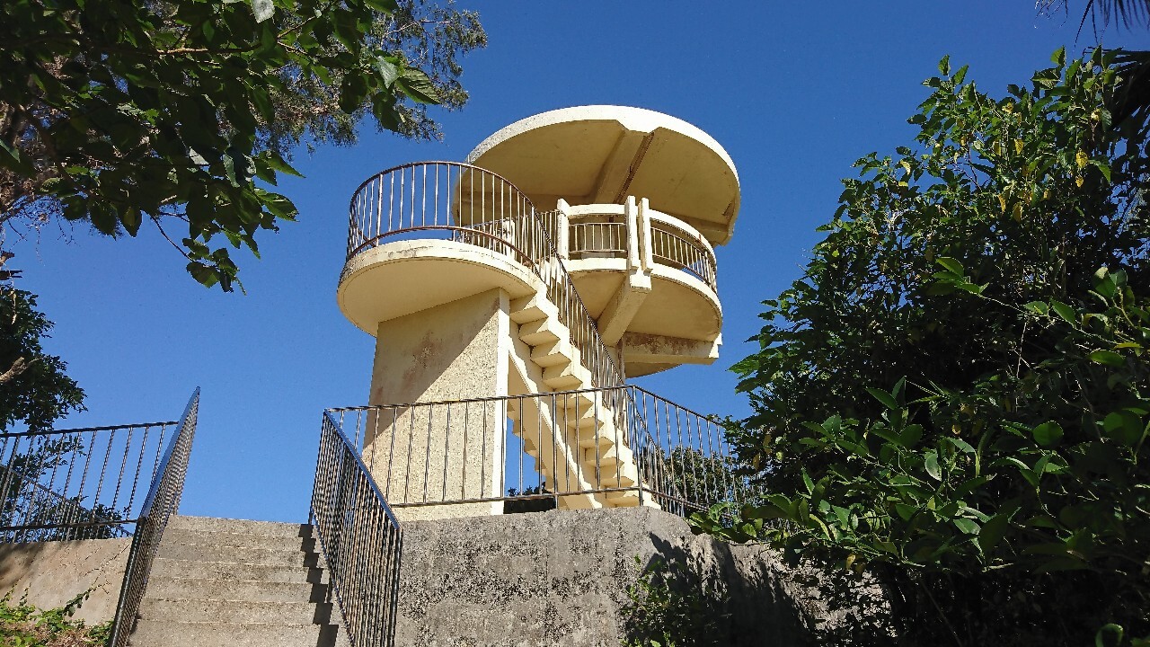 南大東島が一望できる眺めのいい展望台です。説明では、昔この山に日の丸の旗を掲揚して一日の活動の合図としたと言うのが名前の由来とのことです。