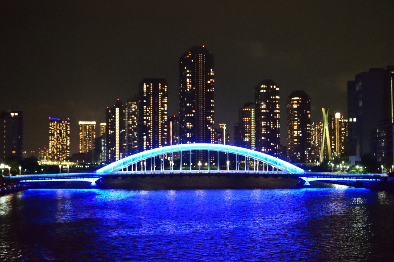 隅田川にかかる永代橋は、夜になるとブルーにライトアップされ美しく輝きます。橋の南側には東京都心の夜景も見ることができ、橋と夜景をの両方を望めます。橋の上からは、北側は東京スカイツリー、南側は東京都心の夜景を一望できます。