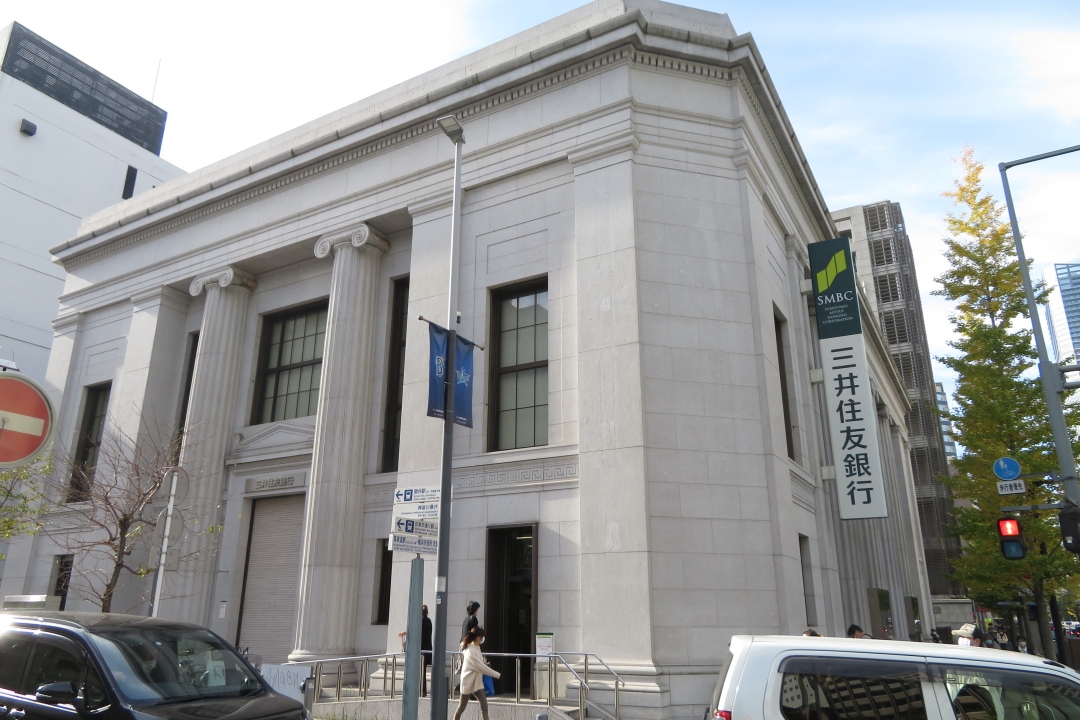 本町通り沿いにある、昭和6(1931)年竣工の歴史ある建物です。竣工当時は、三井銀行横浜支店、現在は銀行が合併して三井住友銀行横浜支店として、現役の銀行の建物です。