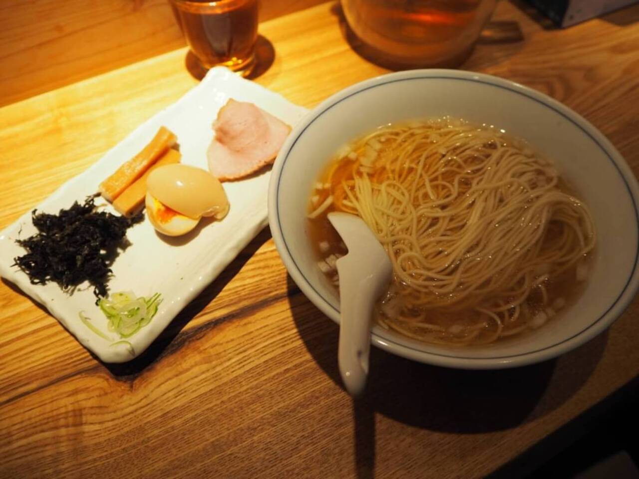 丼には麺とスープだけで、具材は別皿に盛り付けられています。