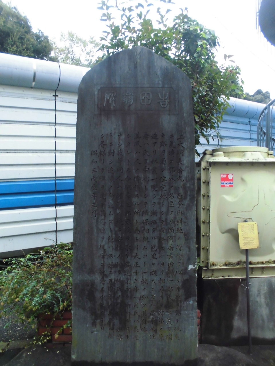 目黒と恵比寿のちょうど中間にありました。この辺りは高級住宅街として知られていますが、この場所を開発して発展のきっかけを作った吉田弥一郎とその息子の幸三郎の二人の業績をたたえる目的で作られました。すぐ近くに首都高が走ってますが住宅街で目立たないようにひっそりとしているのが印象的でした。