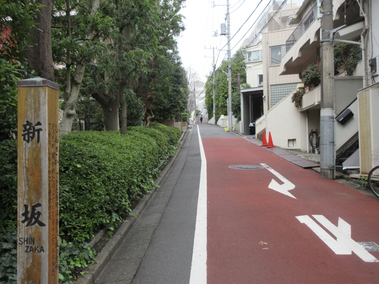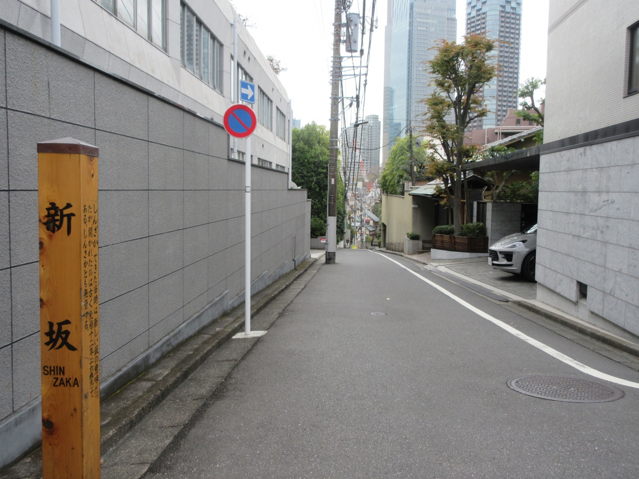 青山通りに面したカナダ大使館脇の道を進み、カナダ大使館職員宿舎と思われる建物の南端から下る坂道が新坂です。1699年に造られた坂道であることが説明柱に記されています。個人宅やマンションが建つ狭い坂道です。休日午前に訪れました。歩く人がぽつぽついる程度で静かな住宅街でした。