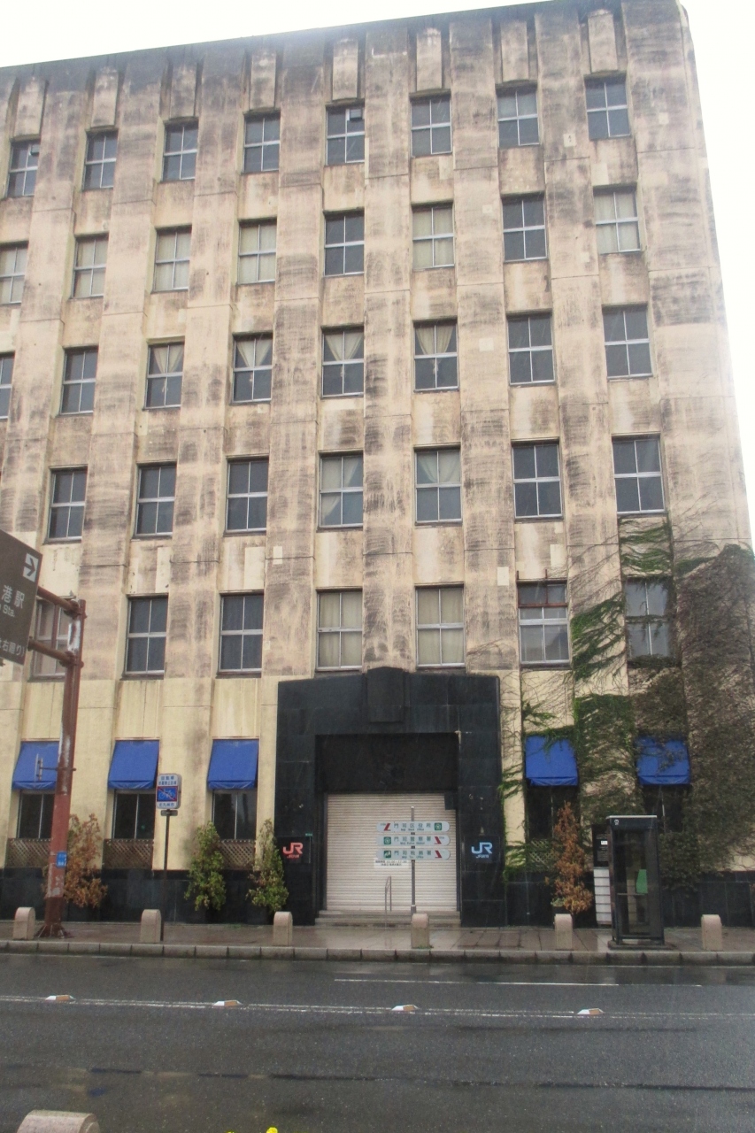 門司駅前広場の東側に面している旧JR九州本社ビルは、工事用の塀が建てかけられています。そして、桟橋通り側の正面入口はそこだけが黒御影石で造られていて、両サイドにJR九州、JR貨物と書かれていますが、シャッターが下ろされています。薄汚れている様子から見ても空きビルの様に見えます。
