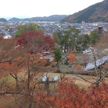 城址の一番上には稲荷神社があり、東側にそこに続く階段がありますが、京都の伏見稲荷を思わせるような鳥居が並んでいます。古い稲荷神社は紅葉と相まって、雰囲気がすばらしいです。上から見る城下町は風情があります。