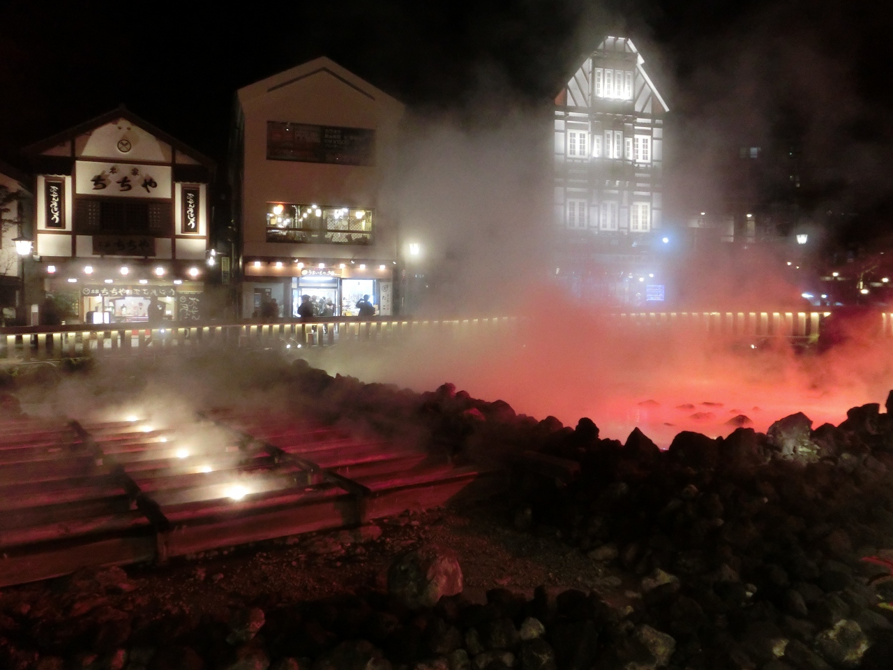 草津温泉の象徴である湯畑をライトアップして、見事に夜の楽しみのひとつとなっています。ほかではなかなか見られないほど大きく、広範囲な湯畑はもうもうと上がる湯けむりを赤や青などのライティングで彩り、観光客が集います。