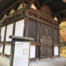 三渓園の南門側、内苑に移築された大徳寺の建築です。豊臣秀吉が母親の長寿祈願のために建てさせたそうで、小さい建物ながら姿が美しい。扉の装飾は目を見張るものがあります。