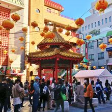 南京町の中央にある広場に建ち、南京町を象徴する建物です。南京町は「あづまや」を中心に、東西約270m、南北約110mに広がっていて、規模はそれほど大きくないのですぐに見つけることができます。週末の夕方に訪れ、何かイベントもあったためか、広場はとても混雑していました。周辺にはお店が立ち並んでいて、豚まんや小籠包等買って食べている人もいました。
