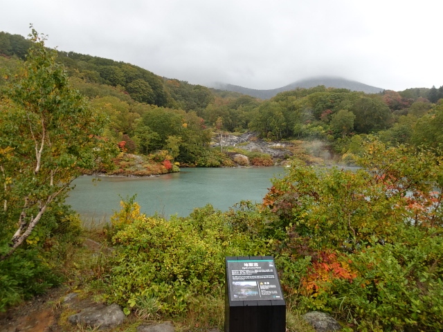 地獄沼のエメラルドがかった沼の色を縁取る紅葉は絵のようです