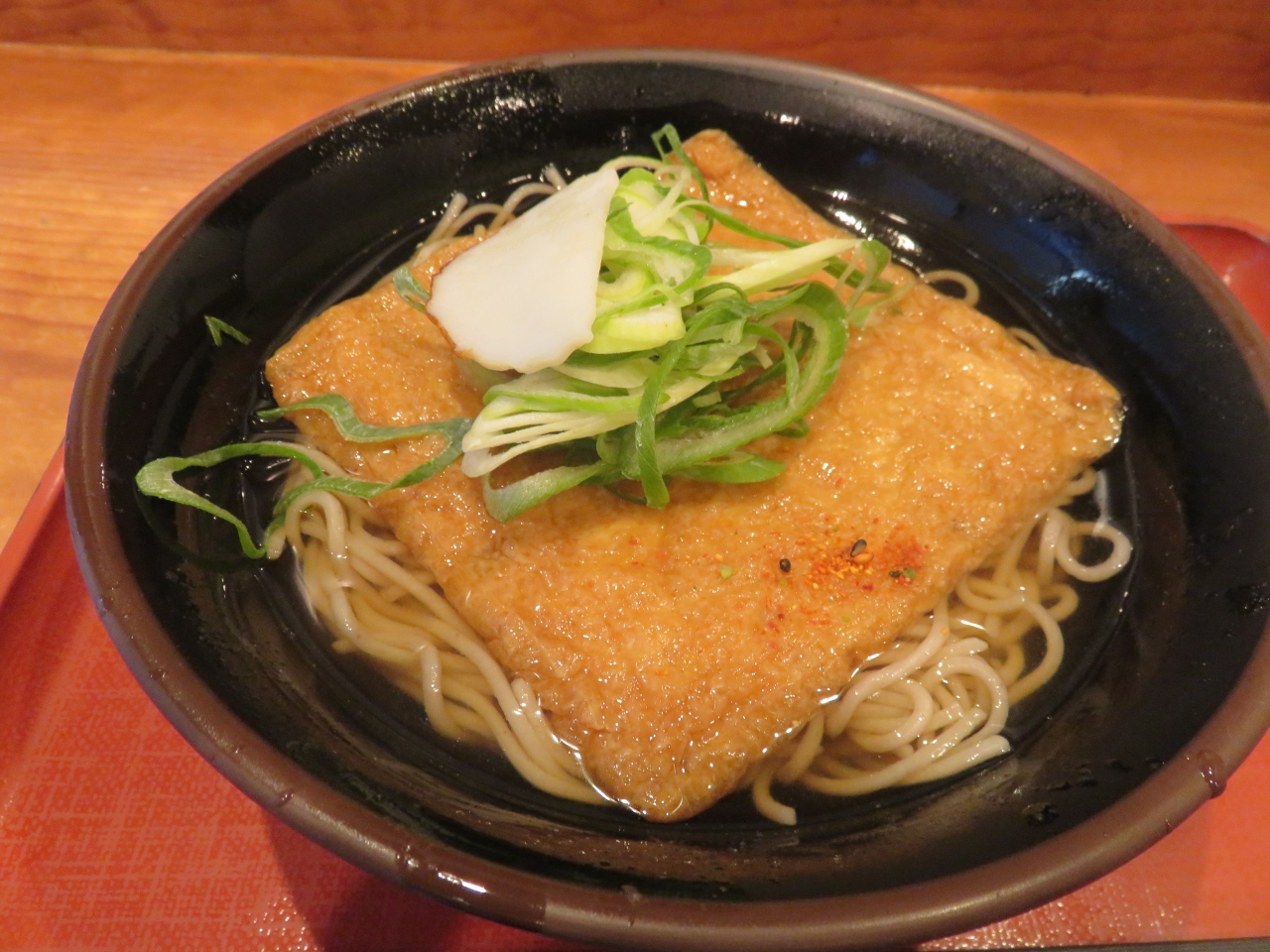 京都駅嵯峨野線ホーム手前にある麺家さがのです。東海道線にも麺家がありますが、そちらは立ち食いですが、さがのは椅子があり、少し落ち着いた雰囲気です。麺は東海道線と違って、やや上品、きつね蕎麦410円と高めです。しかし、味の好みとしては東海道の下がも・上がも店に軍配を上げます。