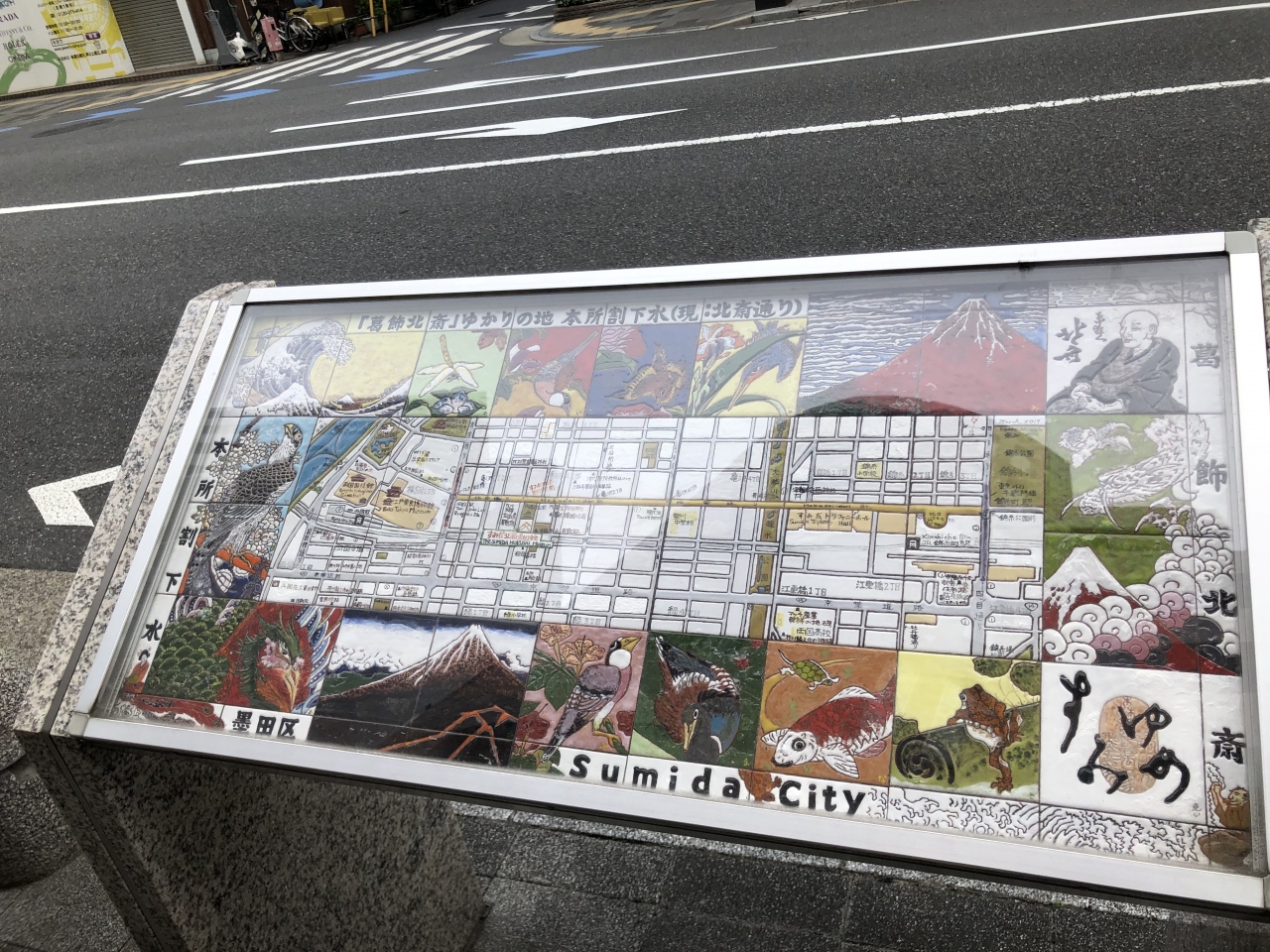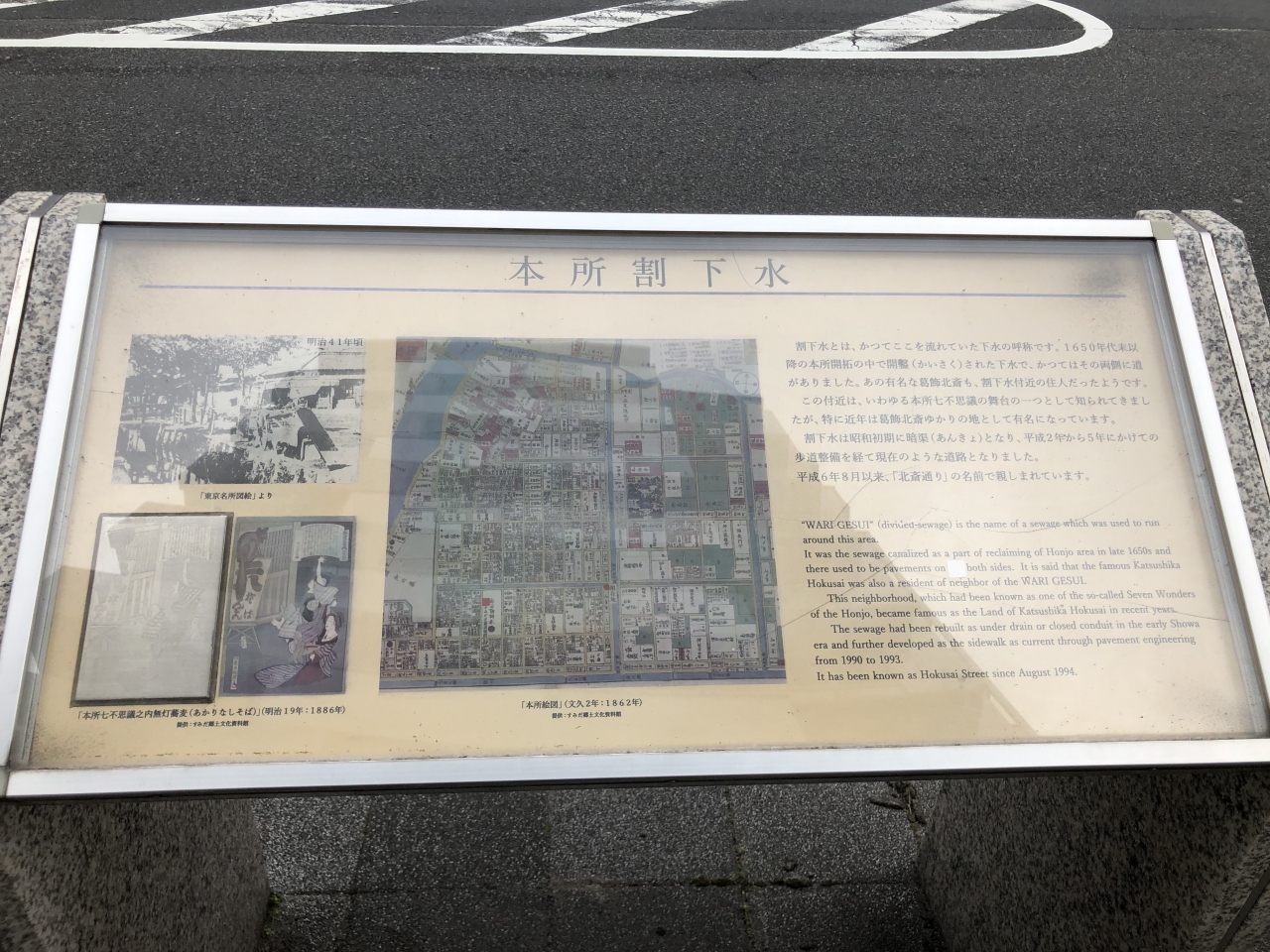 両国から錦糸町へと続く大通りで、葛飾北斎がこの付近で生まれたことに因んでいるそうです。また、江戸時代、本所割下水という下水が流れていた場所でもあり、通り沿いに案内がありました。街路灯が灯篭のような形をしていて趣がありました。