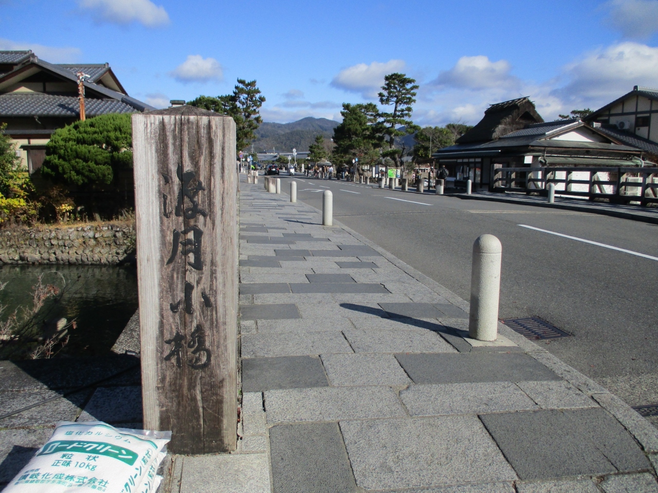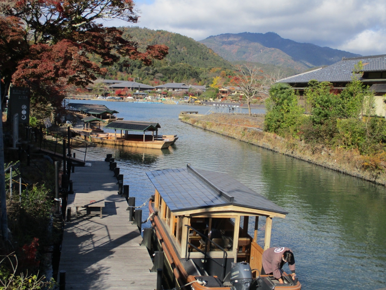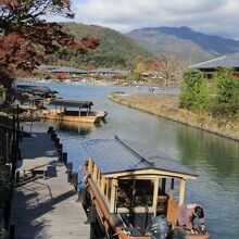 渡月橋の南側にある小さな橋です。この橋の近くに十三まいりで有名な法輪寺や嵐山モンキーパークなどがあります。このあたりから見る景色も風流です。川には観光用船が停泊していました。付近は車がよく通るのでご注意です。