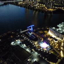 夕暮れ時からららぽーと豊洲のアーバンドッグ前には多くの人が集まっていました。きれいな夕日を見た後、急に寒くなってきましたが、階段に腰かけて、クレーンのライトアップやその向こうに見えるレインボーブリッジのライトアップを楽しむ事ができました。スケートリンクもオープンしていて、ビルの上から見た光景は華やかでした。