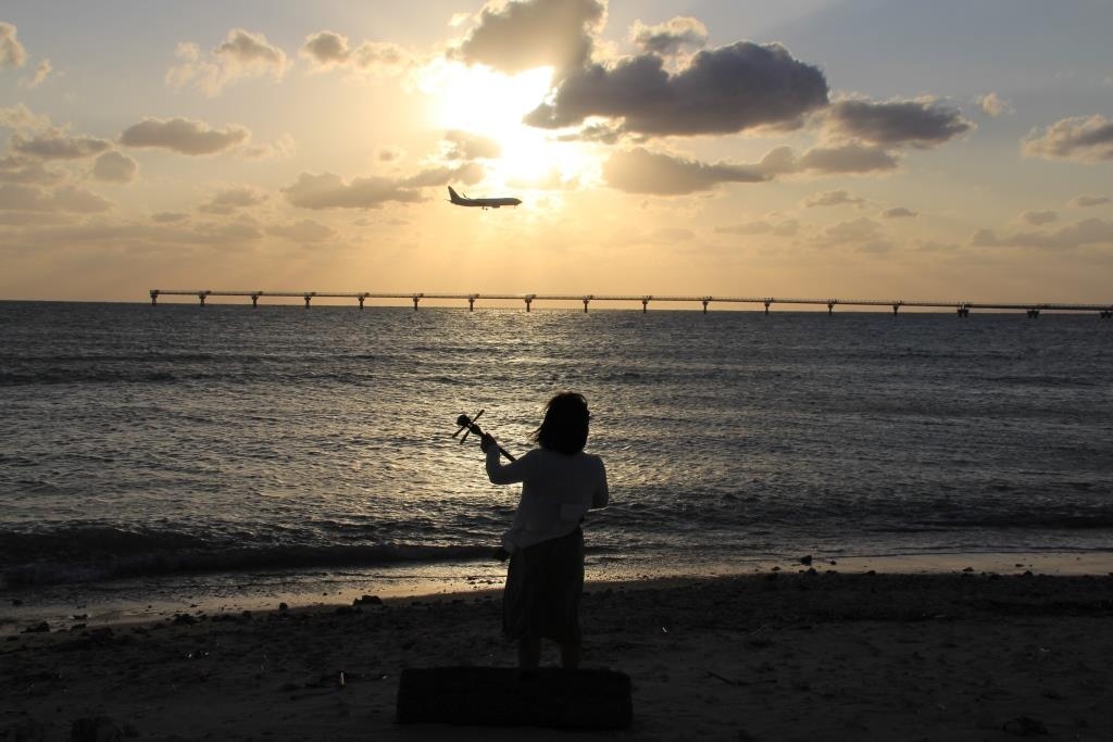 島の砂浜からは夕日がよく見えて、海を眺める人、三線を弾く人、唄う人と、みんな思い思いの遊具でお過ごしています。
