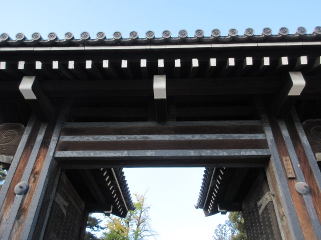 京都御苑への東側の入り口にあたる門です。寺町通りに面していて、東側の門の中の一番南に位置します。門近くには資料館や新島襄の旧邸などがあります。木の門に瓦屋根の乗っている重厚な雰囲気の門で、門をくぐると仙洞御所の築地塀が連なった景色が広がっていました。